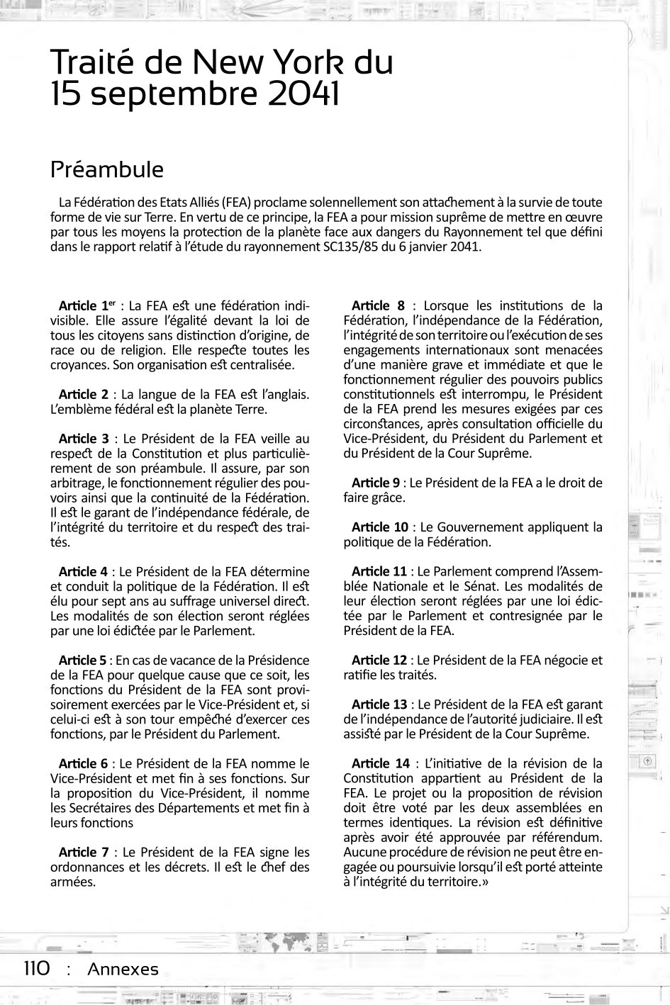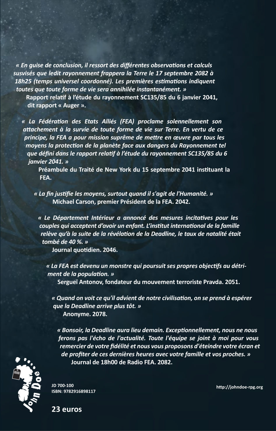 J- 47 ans, 1 mois, 16 jours avant la fin de l’Humanité. La sauvegarde de la vie sur Terre est confiée à la Fédération des États Alliés… à n’importe quel prix !