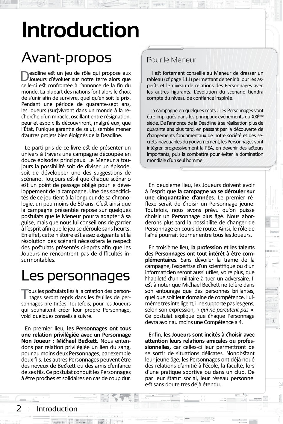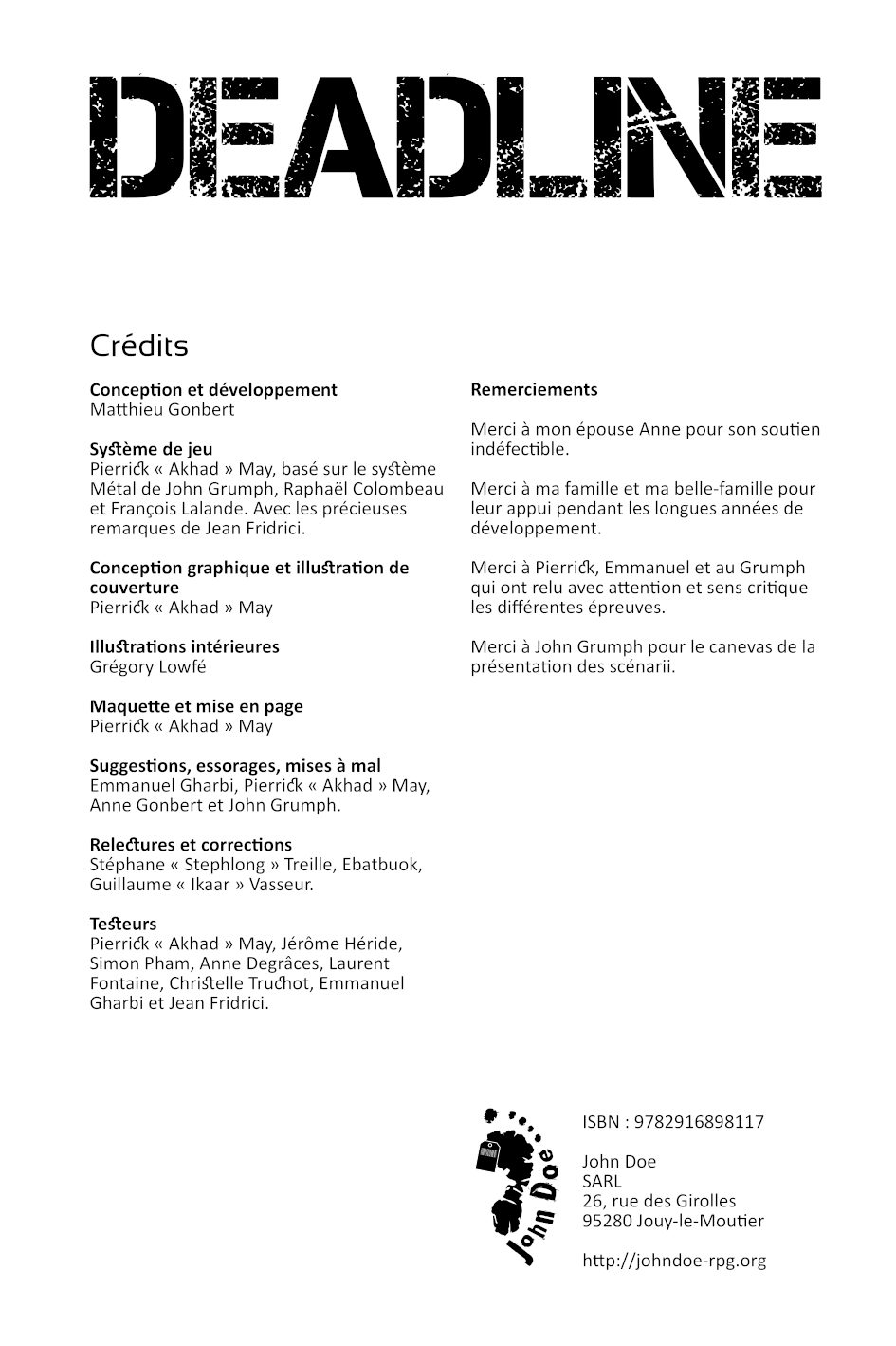 Deadline est un burst : un jeu de rôle-campagne, en un seul ouvrage indépendant, munie d’un système de jeu. Il propose aux joueurs de vivre la vie de riches héritiers dans un futur proche dystopique, au cours d’une campagne d’espionnage high tech sur fond de fin de monde annoncée. À l’aide d’un système de jeu efficace et violent, inspiré du Metal de Bloodlust, et d’une campagne en 12 scénarios, ils devront déjouer la Deadline en étant intimement liés aux événements majeurs de l’histoire.