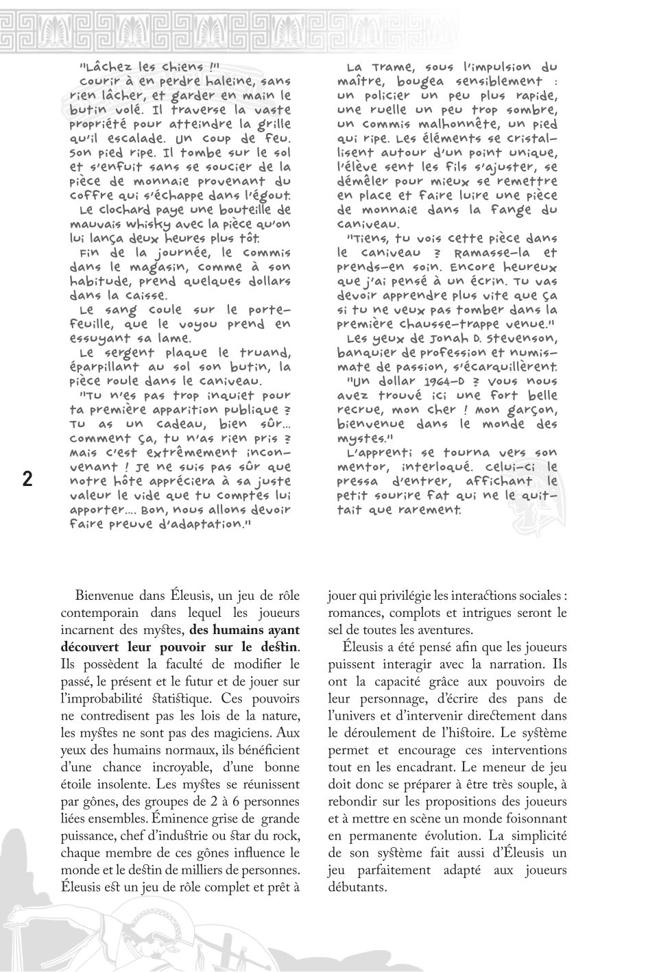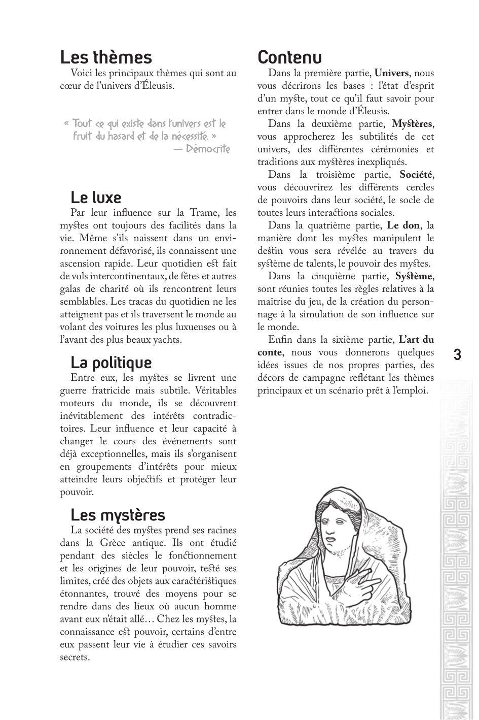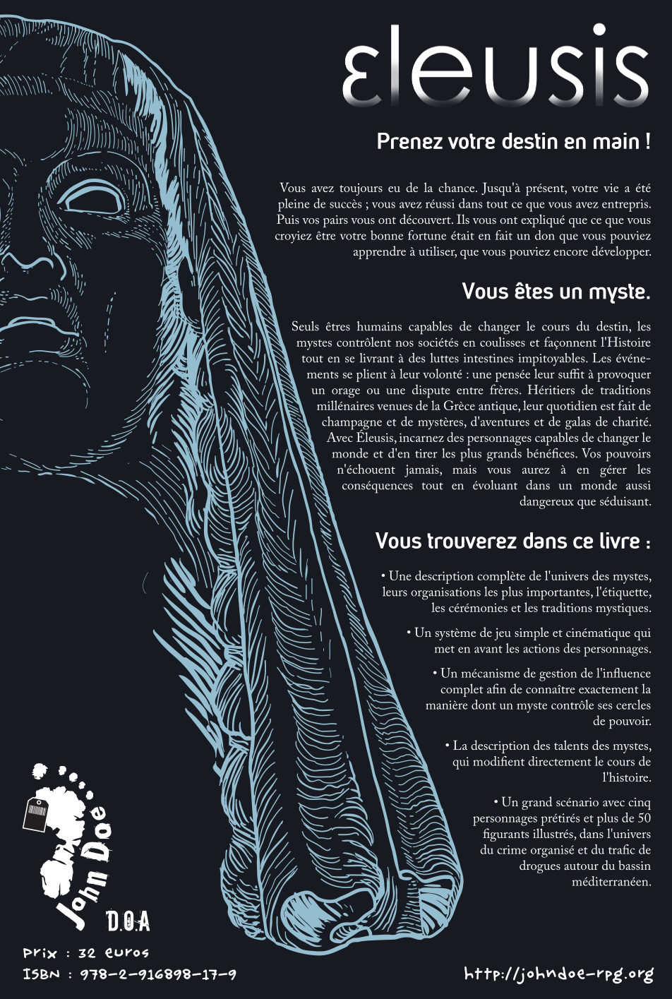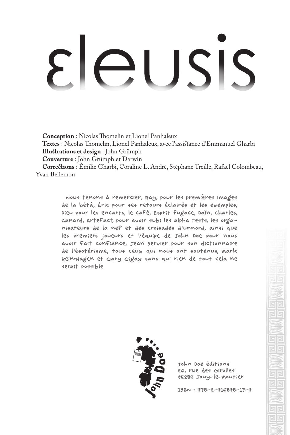 Éleusis est un Dead On Arrival, un jeu de rôle complet ne nécessitant que le livre de base. C’est tout un cadre de jeu libre dans lequel vos joueurs pourront écrire le destin de leurs personnages.