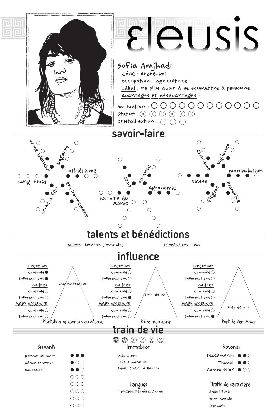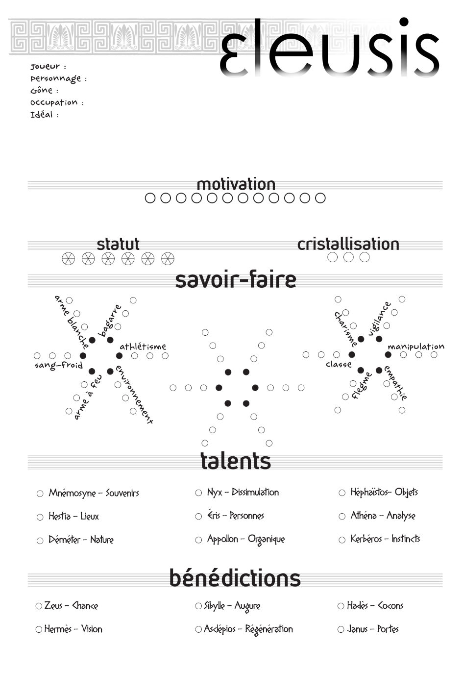 Dans Éleusis, incarnez des personnages capable d’écrire l’Histoire, de changer le monde, et d’en tirer les plus grands bénéfices. Vos pouvoirs n’échouent jamais, mais vous aurez à en gérer les conséquences. Grâce aux pyramides d’influence, vous visualisez directement sur votre fiche où se situe votre véritable emprise sur la société et ce que vous pouvez en faire, pour le bien commun ou pour votre seul avantage.