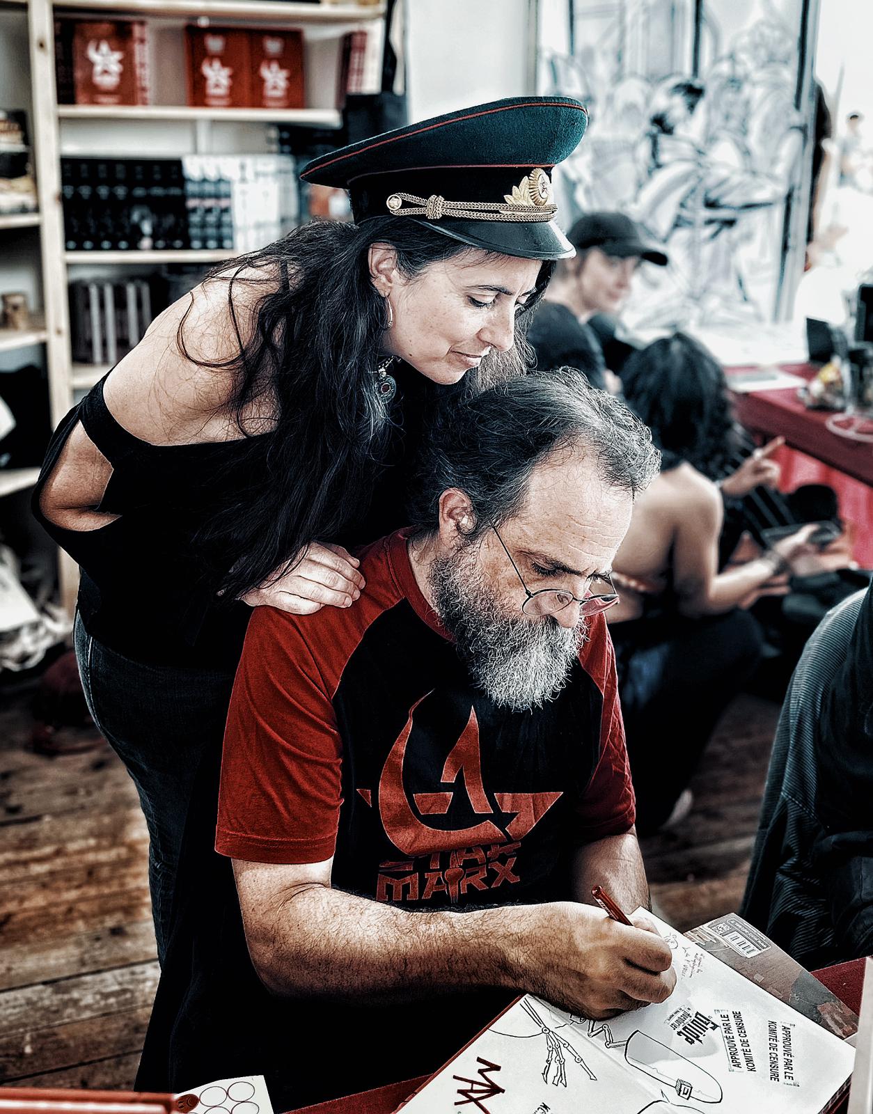Maximilien et La Moitié partagent beaucoup de choses : la même année de naissance, des paires de chaussettes, des chemises de nuit à fleurs, des copies à corriger mais aussi une indéfectible passion pour les cultures de l’imaginaire. Leur seul point d’achoppement est constitué par l’usage des accents dans l’orthographe française. Cette difficulté ne les a toutefois pas empêchés de commettre Star Marx, une création multi primée comme se le doit un univers soviétique, fût-il parodique (prix FFJDR du Jeu de Rôle Amateur en 2013 pour Star Marx, le Soviet des Étoiles toujours disponible gratuitement sur Internet, prix spécial ActuSF de l’Uchronie pour Le Guide de l’Aventurier des Mondes Imaginaires illustré par David Cochard et paru chez Leha, Graal d’Or de la création française en 2021 pour la première édition du jeu de rôle, illustré par David Cochard, Laurent Libessart et Thierry Ségur, et paru chez Leha). Les archivistes minutieux auront noté leur participation à plusieurs ouvrages de jeux de rôle ici et là : Laelith ou Les Provinces du Haut-Lac (chez BBE), MEGA 5e paradigme (chez Leha) ou Pique-Nique dans les Zones (un supplément pour Stalker, chez La Loutre rôliste). En attendant leurs nouvelles parutions, on peut se régaler les mirettes avec Les Royaumes Éparpillés, un autre Guide de l’Aventurier des Mondes Imaginaires avec le génial Thierry Ségur aux pinceaux, paru également chez Leha.